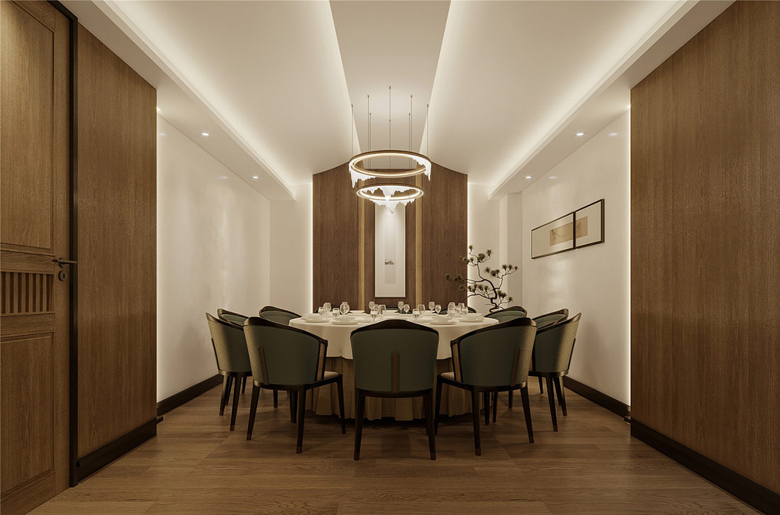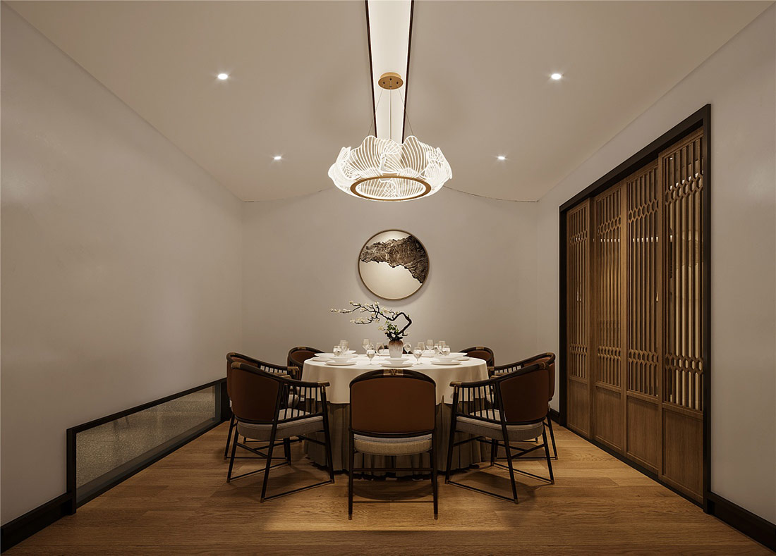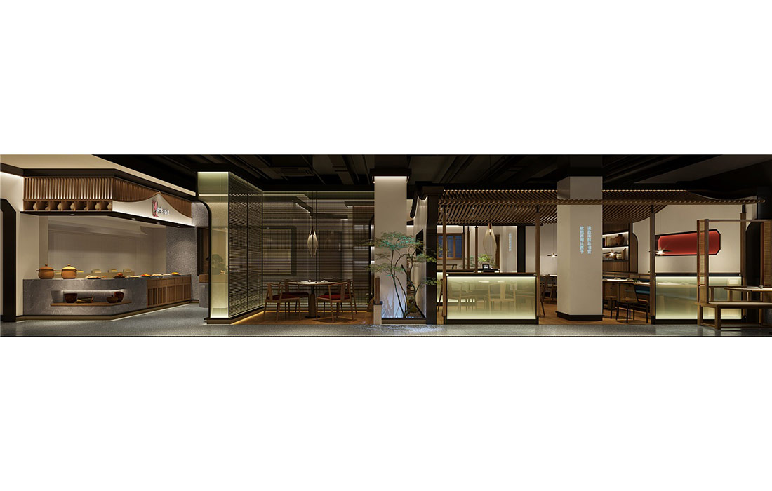 设计理念: 济南餐饮装修效果。其装修效果图体现了浓郁的中式风情,采用木质材料和精致雕花装饰,营造出温馨典雅的就餐环境。整体色调以暖色为主,搭配古典家具和艺术品,让顾客在品尝美食的同时,也能感受到中华文化的博大精深。