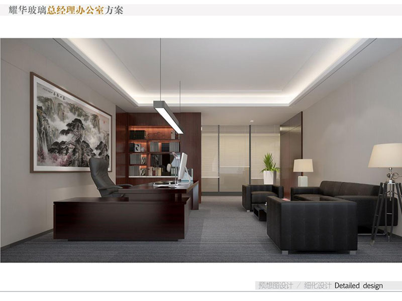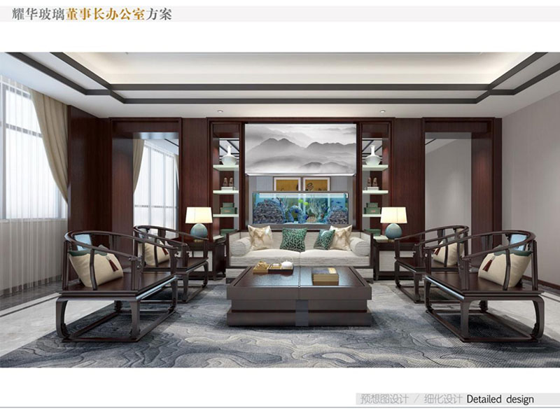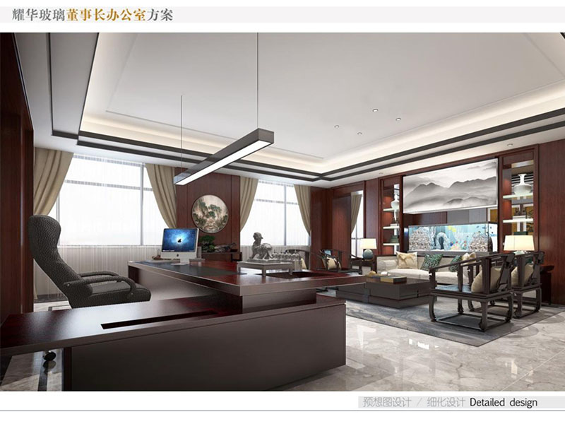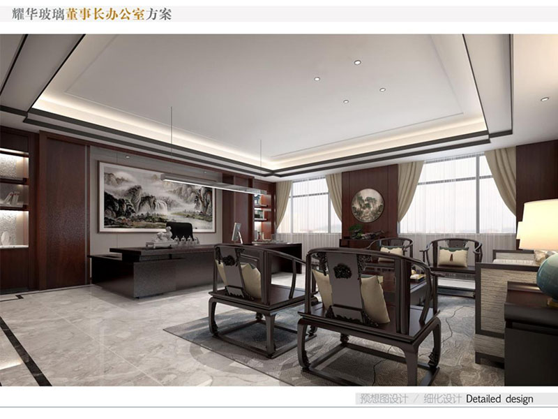 设计理念: 耀华玻璃董事长办公室装修效果图彰显出了企业的高端形象。董事长办公室设计采用了中式风格,运用高质量的木材、优质玻璃等,给办公室营造出沉稳的气氛。空间布局合理,既有宽敞的办公区,也有舒适的接待室和休息区。同时,办公室内也会融入耀华玻璃的特色元素,如玻璃艺术品或公司标志,体现企业品牌和创新精神。