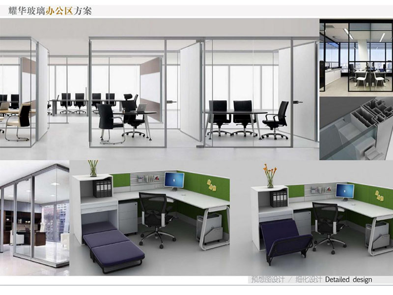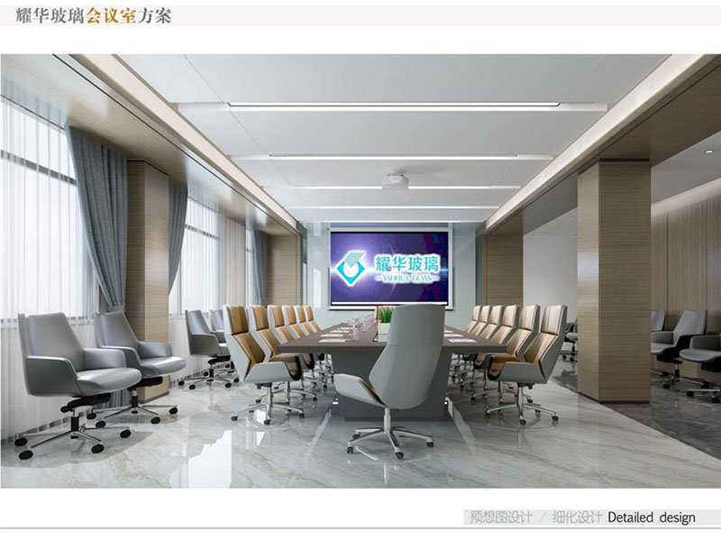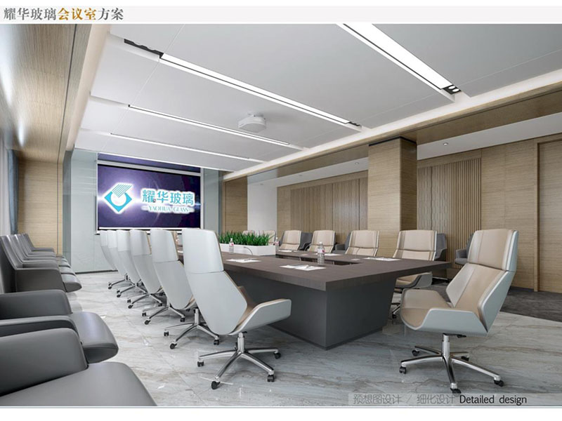 设计理念: 耀华玻璃办公区装修效果注重体现了现代与实用性的结合。办公空间宽敞明亮,采用高品质材料打造,使用耀华玻璃作为隔断墙提升了整体美观度,而且采用落地窗可以增强自然采光效果。会议室空间足够大,利用了耀华玻璃进行隔断,从而达到了隔音效果好。营造出高效、舒适的办公环境。