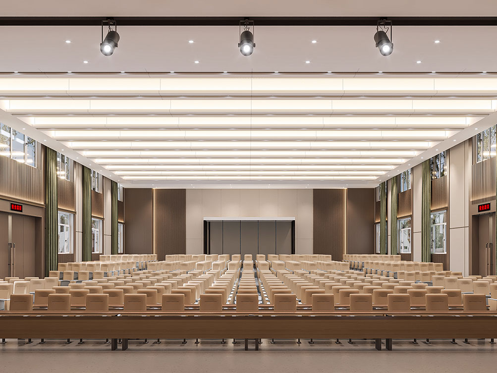设计理念: 作为济南办公室装修中大型功能空间的代表,该大堂报告厅以沉稳木饰面 + 金属线条铺陈基调,顶部穿孔吊顶搭配嵌入式灯光,兼顾声学与视觉通透感。巨幅电子屏 + 对称音响设备适配会议、汇报需求,米色座椅与红色台阶营造庄重又舒适的氛围,是济南办公室装修中高规格功能空间的典型设计。