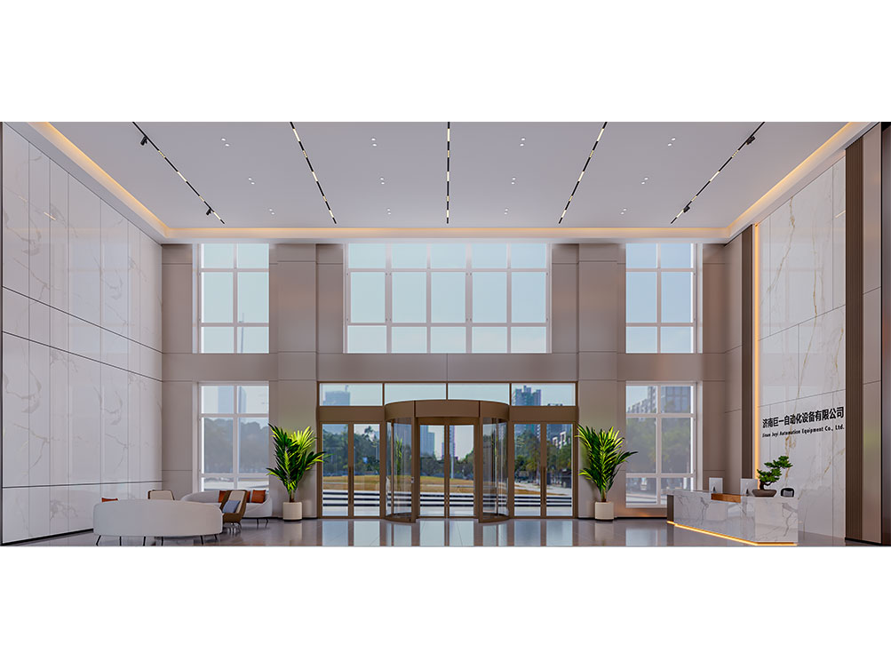 设计理念: 作为济南办公室装修中企业形象型空间的代表,巨一自动化大堂以大理石饰面 + 金属线条打造轻奢质感:挑高空间搭配嵌入式灯光,强化大气氛围;弧形旋转门与绿植点缀柔化冷硬,前台与品牌墙的一体化设计精准传递企业形象,契合济南办公室装修商务展示接待功能的核心需求,是济南工业企业办公空间的高端范本。