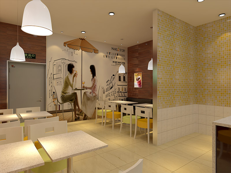 设计理念: 济南奶茶店甜品店装修设计-芒果主题饮吧装修效果温馨而甜蜜,以暖色调为主,营造出浪漫氛围。店内灯光柔和,照亮每一款精致甜品与饮品,令人垂涎欲滴。墙面装饰甜蜜主题贴纸,增添趣味性。座位区布局舒适,适合朋友小聚或情侣约会,营造轻松愉悦的用餐体验。整体设计既符合年轻人的审美,又充满甜蜜幸福感。