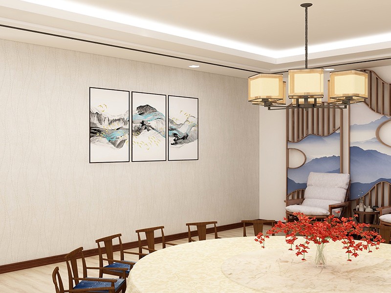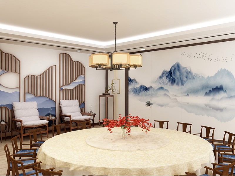 设计理念: 中铁二十一局集团轨道交通工程有限公司员工餐厅装修设计施工以自然、温馨为主题,整体色调偏暖色,营造出一种舒适愉悦的用餐环境。店内运用了中式风格作为装饰,展现出具有古老文化质朴的氛围。使用柔和的照明设计,如暖色调的吊灯,更是为用餐环境增添了一份温馨感。